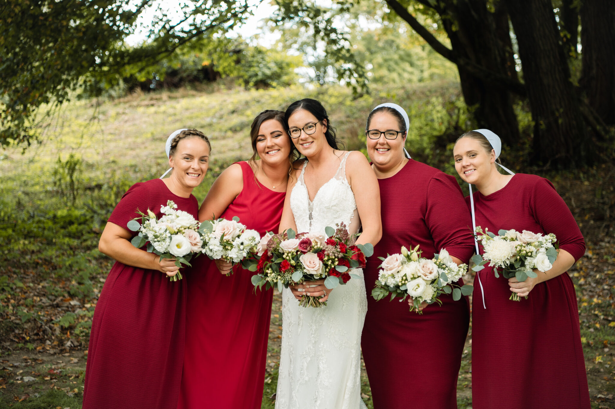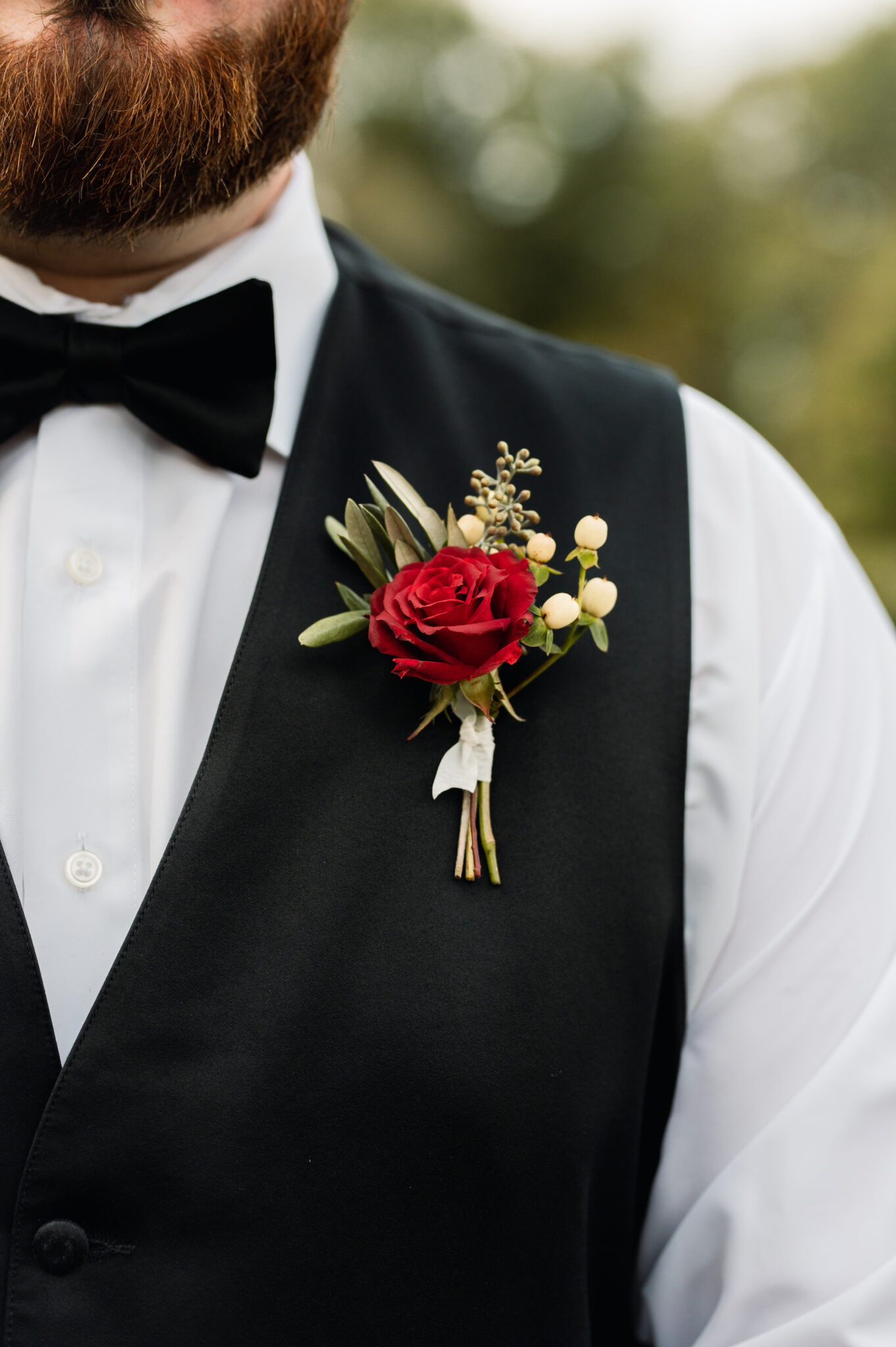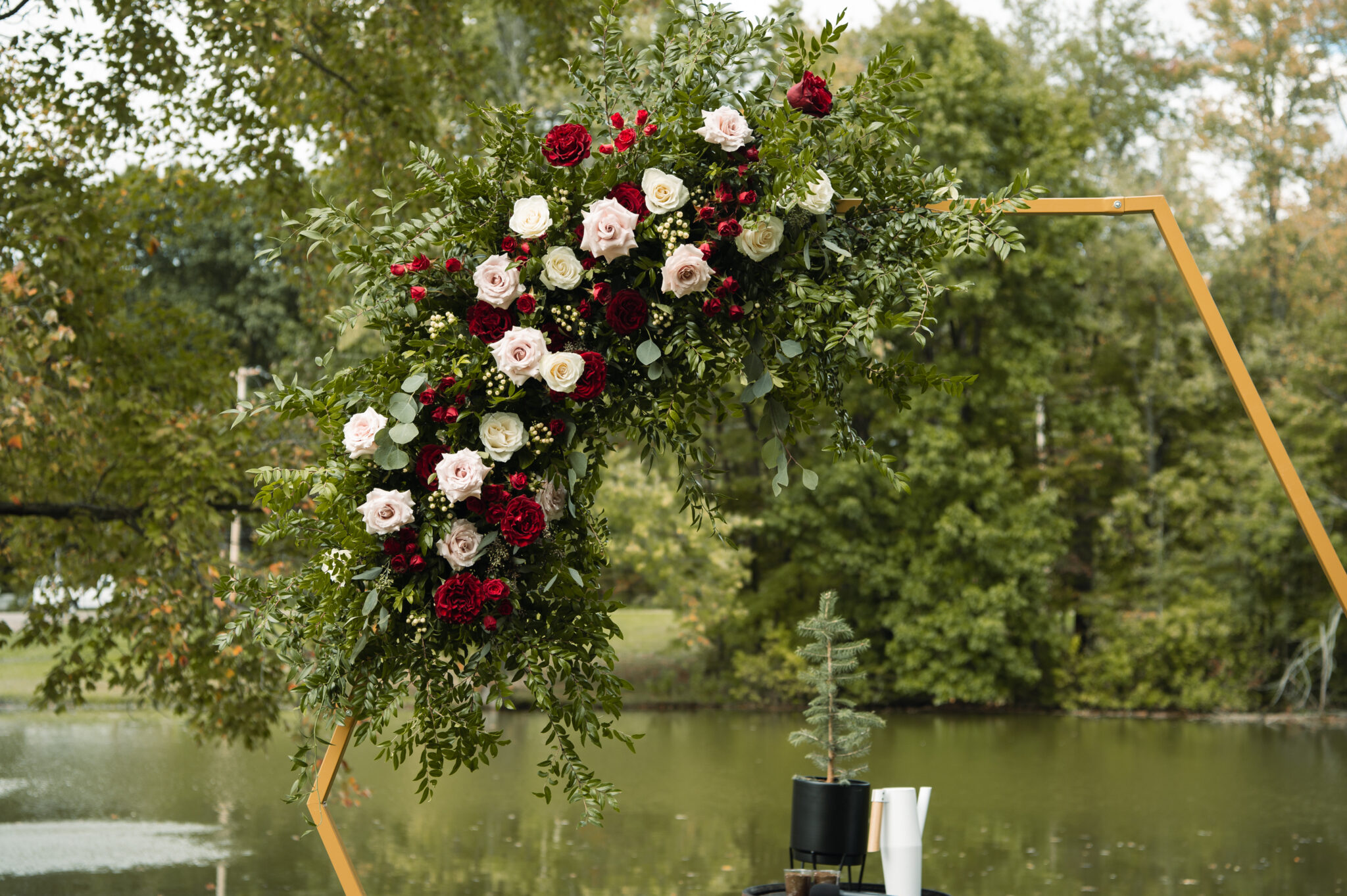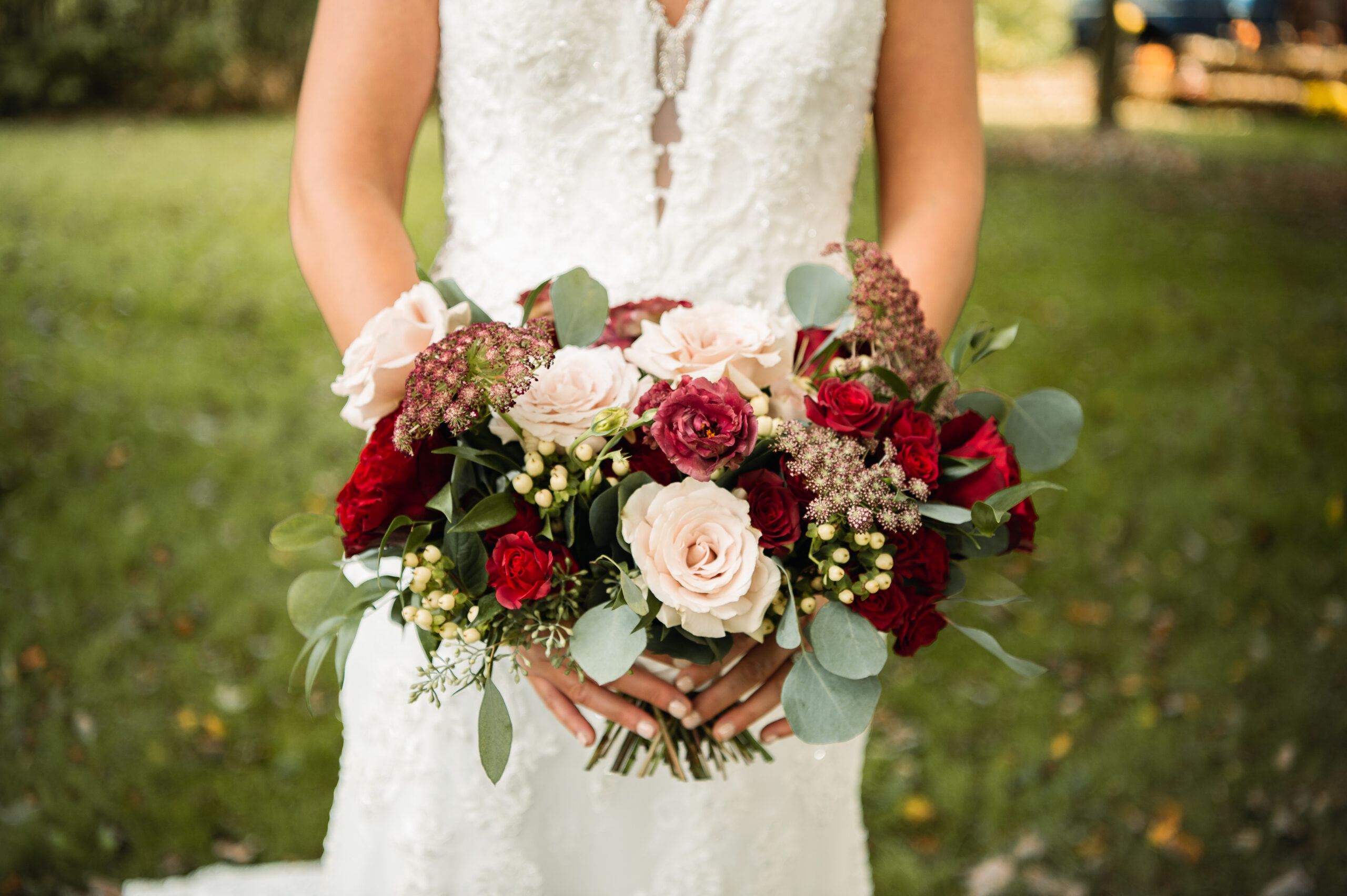 Marlene chose blush and burgundy as her color palette and I was able to finally use my favorite blush roses again after months of only wishing for them due to a blush rose shortage. Other flowers used included burgundy garden roses, lisianthus, spray roses, chocolate Queen Anne’s lace, along with ruscus, eucalyptus, and hypericum berries.