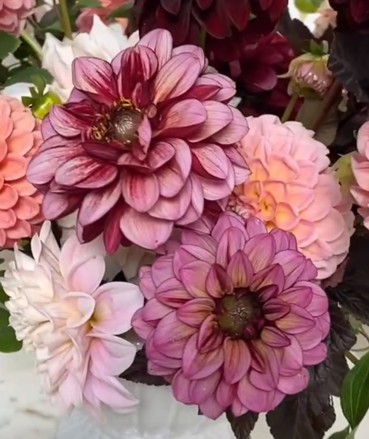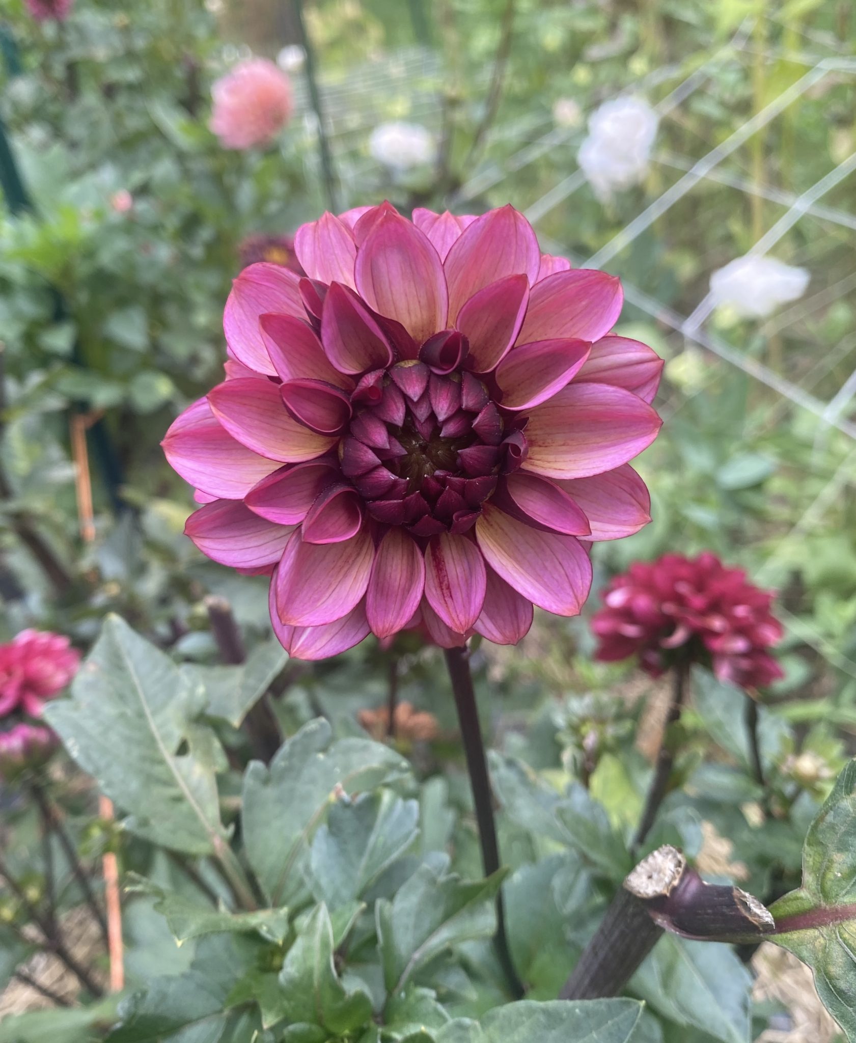 Plum pink and mauve/raspberry dahlia with gorgeous contrast and medium sized blooms on sturdy stems. Moody and dramatic with darker foliage and stems. One of my favorites–she’s just so pretty! Does not grow as tall as some dahlias, probably around 3′.